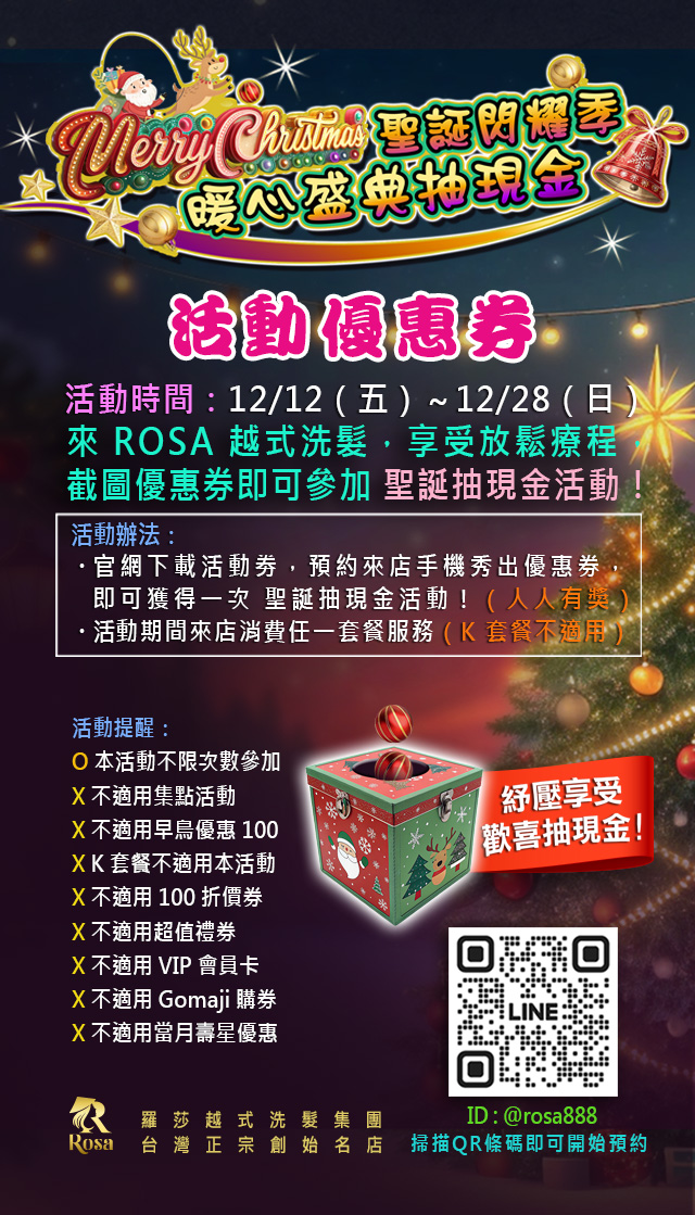 來 ROSA 越式洗髮,享受放鬆療程,截圖優惠券即可參加 🎯 聖誕抽現金活動!